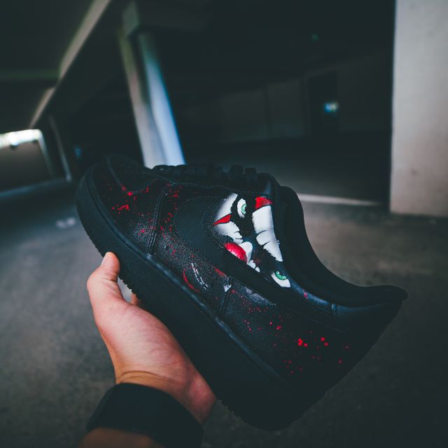 These shoes are black air force 1s with a joker design on both outsides. If you don’t like something on the shoe and want to remove something, let me know in the notes at the checkout. The paint on the shoes is permanent!