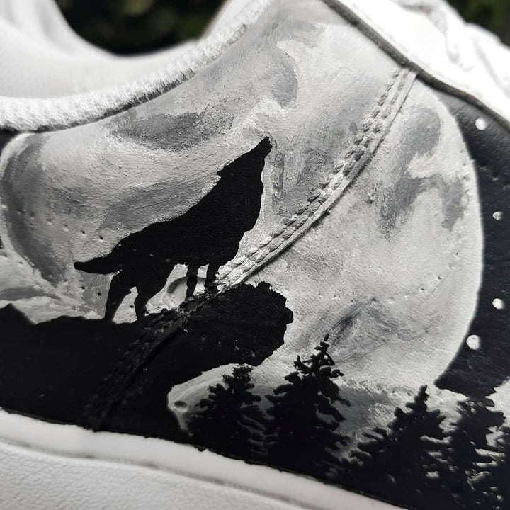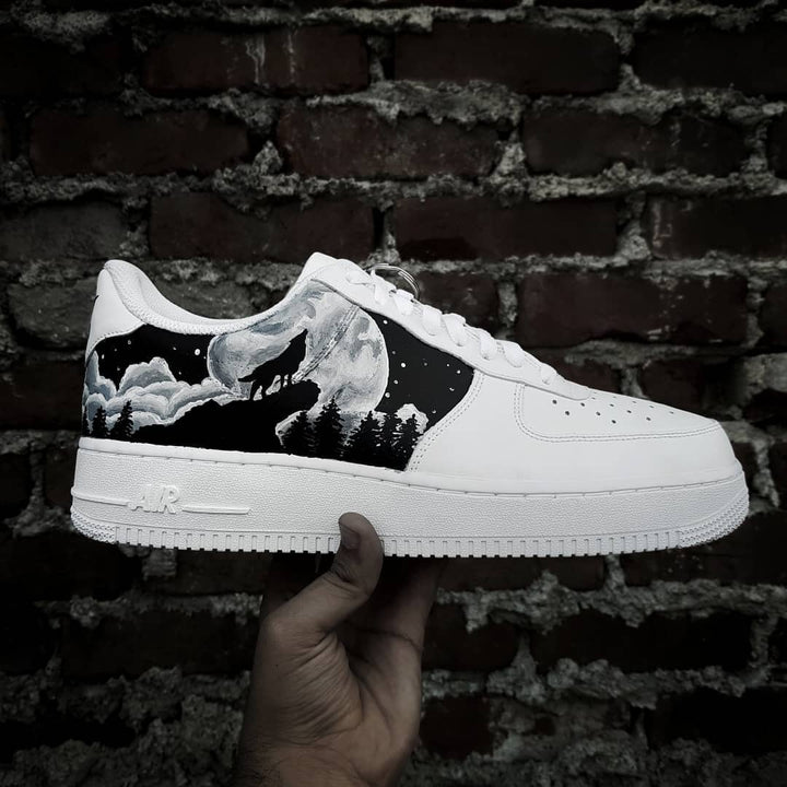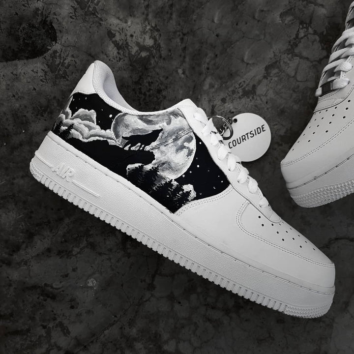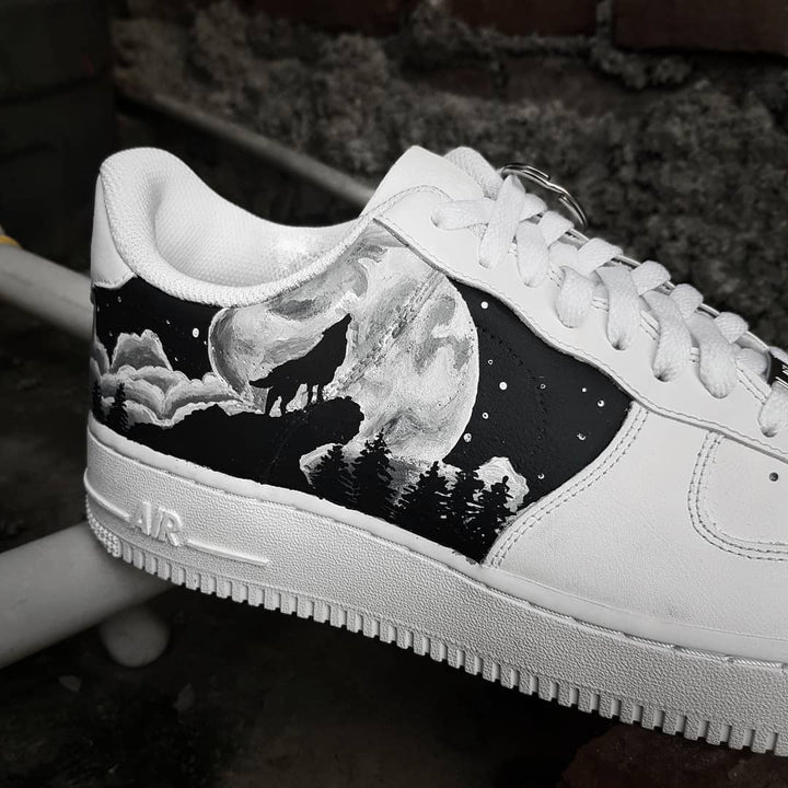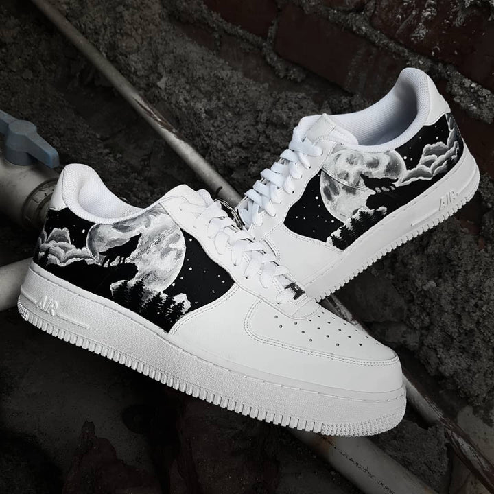 Unleash the wild side with our Moonlight Wolf forest Black White Custom Air Force 1s! Dare to step out of the ordinary with these bold sneakers featuring a fearless wolf design and sleek black and white color scheme. Take on any challenge with confidence in these one-of-a-kind shoes.