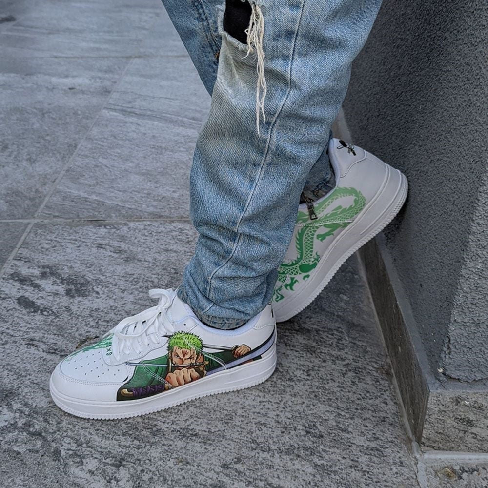 The One Piece Sauron Green Dragon Custom Air Force 1 is a stylish and comfortable sneaker with a unique custom design. It features a green dragon-patterned upper with intricate detailing, a white midsole, and green laces for added contrast. Together, these features create a striking combination of fashion and function.
