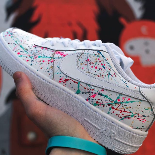 These shoes are white air force 1s with a colorful paint splatter design. The patterns are on both sides of the shoes and on the back. If You don’t like anything on shoes and want to remove something please let me know. The paint on the shoes is permanent! The price includes the shoes + artwork