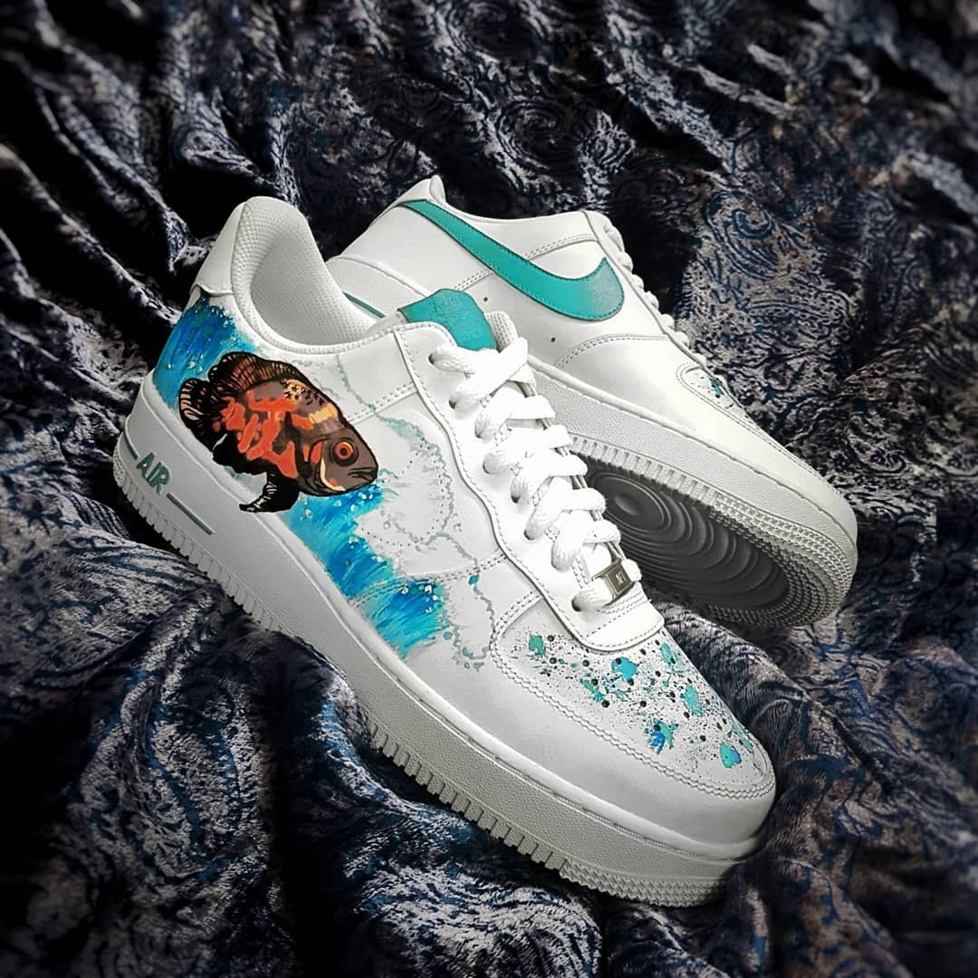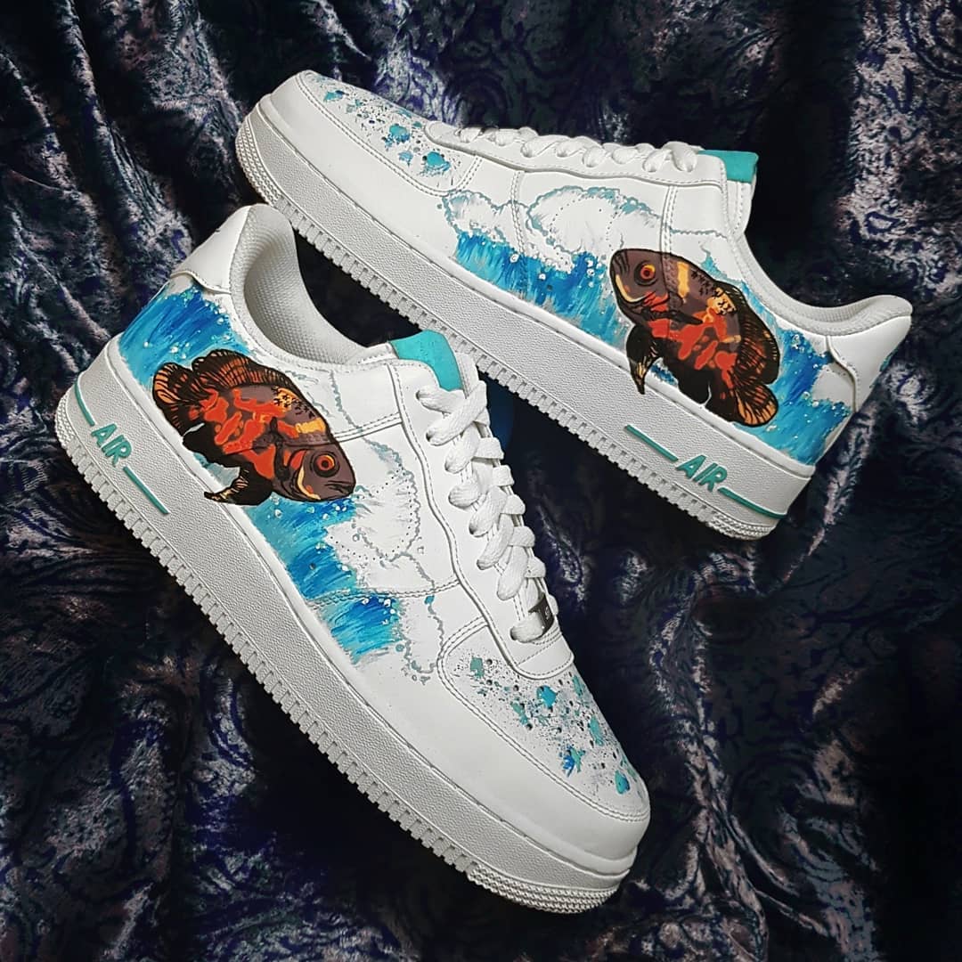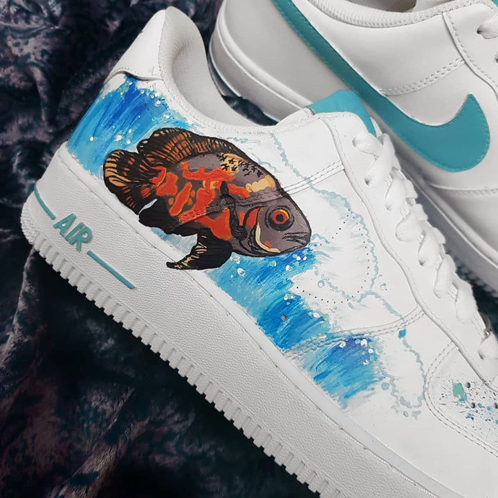 Make a splash with these custom Air Force 1s in sea-inspired shades of blue, orange, and brown. Perfect for ocean lovers and sneakerheads alike. Catch the wave now!